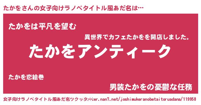 たかをさんの女子向けラノベタイトル風あだ名は… 『たかをアンティーク』『たかをは平凡を望む』『男装たかをの憂鬱な任務』 ツクッター #女子向けラノベタイトル風あだ名ツクッター http://tkutter.nan7.net/joshimukeranobetaitoruadana/119958/
