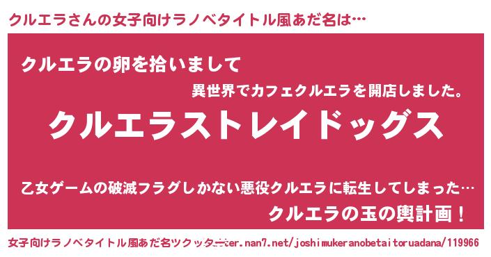 | 男性向けラノベタイトル風あだ名 | 『Re:クルエラから始める異世界生活』 |