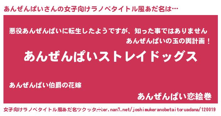 | 男性向けラノベタイトル風あだ名 | 『Re:あんぜんぱいから始める異世界生活』 |