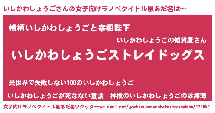 | 男性向けラノベタイトル風あだ名 | 『Re:いしかわしょうごから始める異世界生活』 |