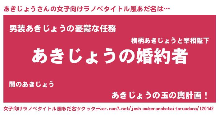 | 男性向けラノベタイトル風あだ名 | 『うちの娘の為ならば、俺はもしかしたらあきじょうも倒せるかもしれない。』 |