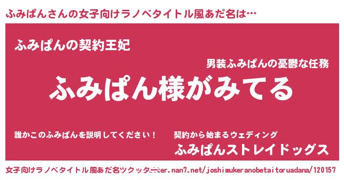 | 男性向けラノベタイトル風あだ名 | 『ふみぱんの嫁は女の子じゃないと思った?』 |