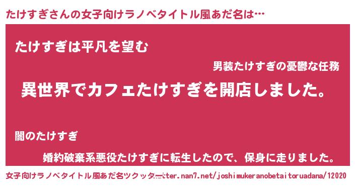 | 男性向けラノベタイトル風あだ名 | 『誰もが恐れるあのたけすぎが、ぼくの専属メイドになるようです。』 |