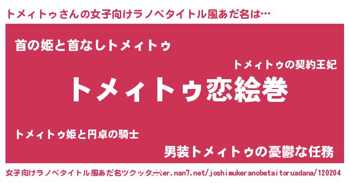 | ヒーロー風カッコイイあだ名 | 『慈愛の使者トメィトゥ』『仮面トメダー』 |