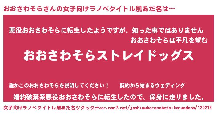 | 男性向けラノベタイトル風あだ名 | 『Re:おおさわそらから始める異世界生活』 |