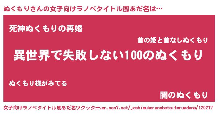 | 胡散臭い通販商品みたいなあだ名 | 『絶対に幸福をもたらす水素水…その名も「ぬくもり」』 |