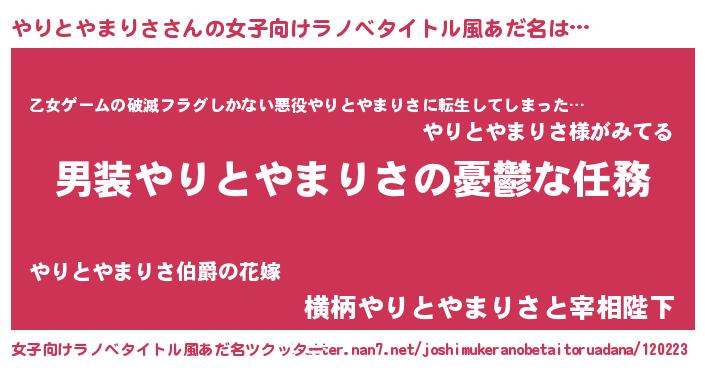 | 男性向けラノベタイトル風あだ名 | 『うちのやりとやまりさが世界を掌握している!』 |