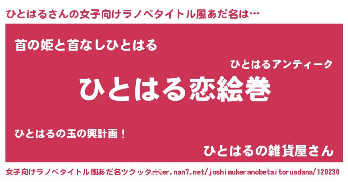 | 男性向けラノベタイトル風あだ名 | 『おまえをオタクにしてやるから、俺をひとはるにしてくれ! 』 |