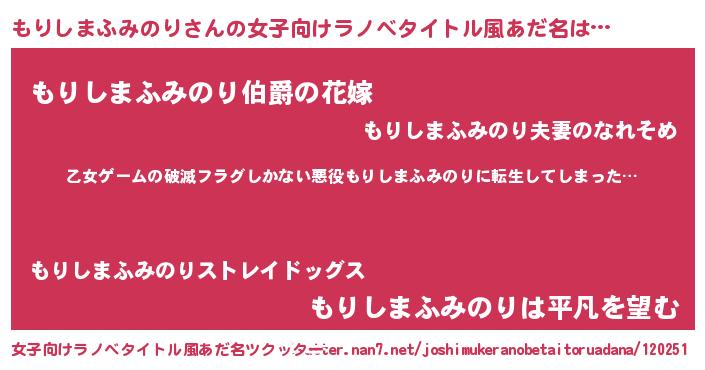 | 男性向けラノベタイトル風あだ名 | 『この素晴らしい世界にもりしまふみのりを!』 |