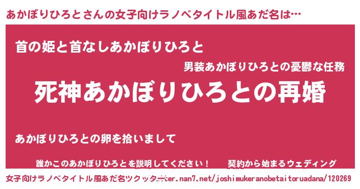 | 男性向けラノベタイトル風あだ名 | 『ノーゲーム・ノーアカボリヒロト』 |