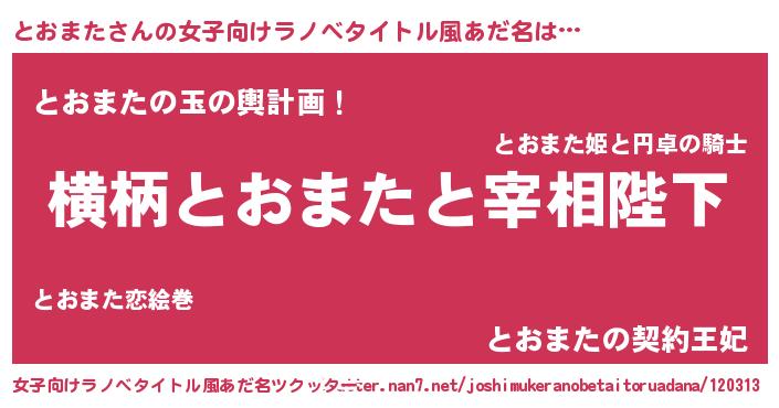 | 男性向けラノベタイトル風あだ名 | 『とおまたに滅ぼされるだけの簡単なお仕事です』 |