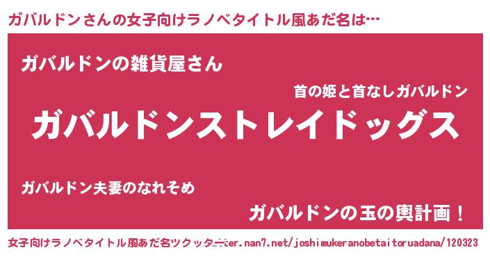 | 男性向けラノベタイトル風あだ名 | 『Re:ガバルドンから始める異世界生活』 |