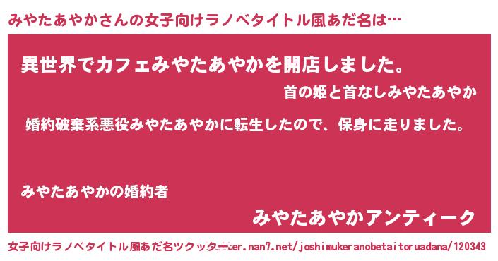 | 男性向けラノベタイトル風あだ名 | 『転生したらみやたあやかだった件』 |
