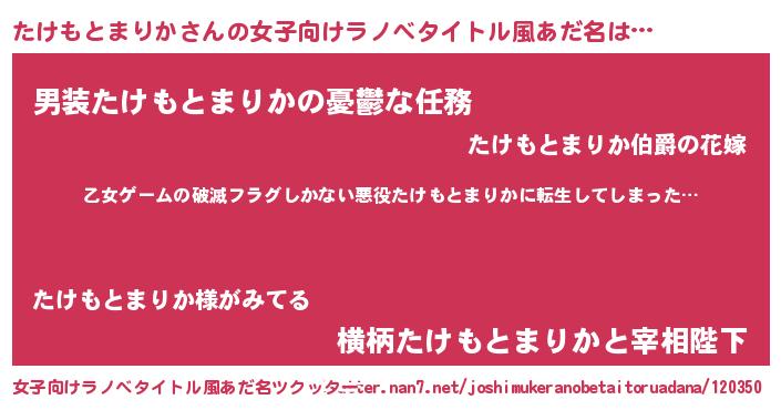| 男性向けラノベタイトル風あだ名 | 『魔弾の王とたけもとまりか』 |