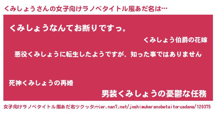 | 男性向けラノベタイトル風あだ名 | 『この素晴らしい世界にくみしょうを!』 |