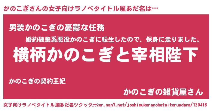 かのこぎさんの女子向けラノベタイトル風あだ名は… 『横柄かのこぎと宰相陛下』『男装かのこぎの憂鬱な任務』『かのこぎの雑貨屋さん』 ツクッター #女子向けラノベタイトル風あだ名ツクッター http://tkutter.nan7.net/joshimukeranobetaitoruadana/120418/