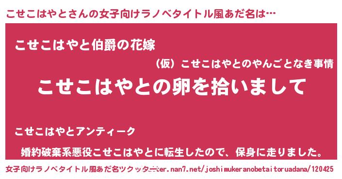 | 胡散臭い通販商品みたいなあだ名 | 『伝統あるサプリメント…その名も「こせこはやと」』 |