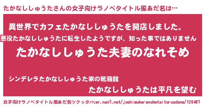 | 男性向けラノベタイトル風あだ名 | 『おまえをオタクにしてやるから、俺をたかなししゅうたにしてくれ! 』 |