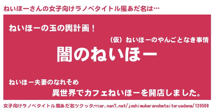 | 男性向けラノベタイトル風あだ名 | 『Re:ねいほーから始める異世界生活』 |