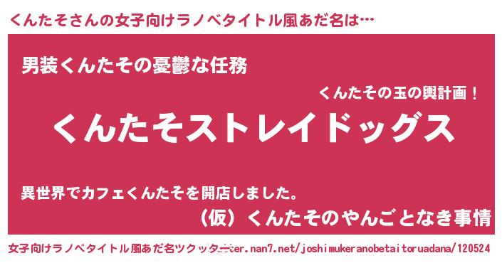 | 男性向けラノベタイトル風あだ名 | 『Re:くんたそから始める異世界生活』 |