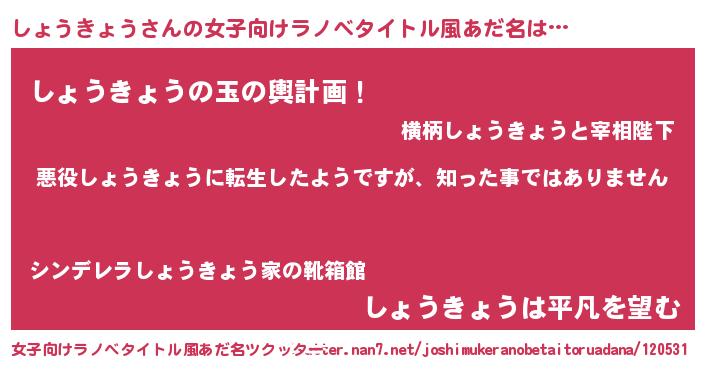 | 男性向けラノベタイトル風あだ名 | 『この素晴らしい世界にしょうきょうを!』 |