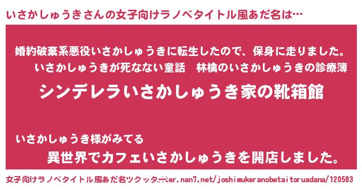 | 胡散臭い通販商品みたいなあだ名 | 『来世でも幸せになれる水素水…その名も「いさかしゅうき」』 |