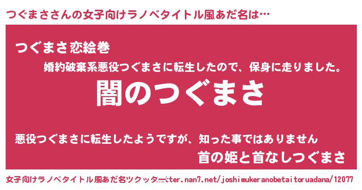| 男性向けラノベタイトル風あだ名 | 『Re:つぐまさから始める異世界生活』 |