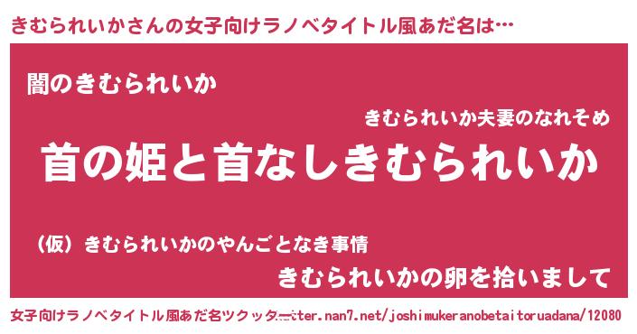 きむられいかさんの女子向けラノベタイトル風あだ名は… 『首の姫と首なしきむられいか』『闇のきむられいか』『きむられいかの卵を拾いまして』 ツクッター #女子向けラノベタイトル風あだ名ツクッター http://tkutter.nan7.net/joshimukeranobetaitoruadana/12080/
