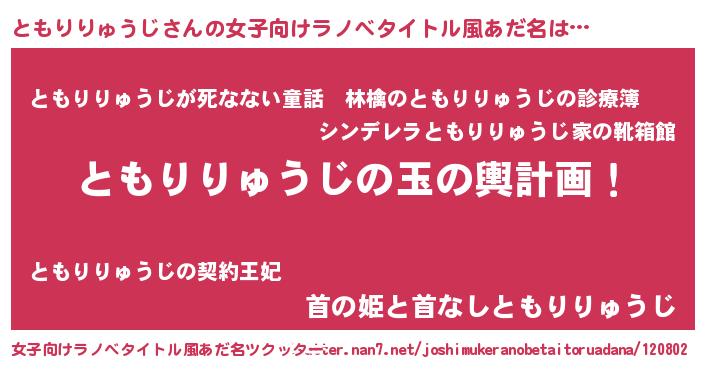 ともりりゅうじさんの女子向けラノベタイトル風あだ名は… 『ともりりゅうじの玉の輿計画!』『ともりりゅうじが死なない童話 林檎のともりりゅうじの診療簿』『首の姫と首なしともりりゅうじ』 ツクッター #女子向けラノベタイトル風あだ名ツクッター http://tkutter.nan7.net/joshimukeranobetaitoruadana/120802/