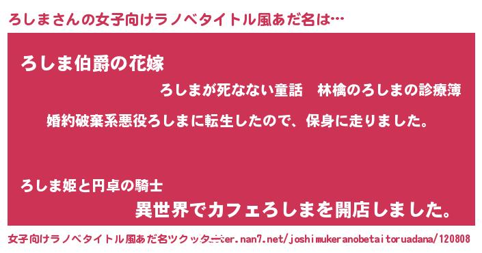 ろしまさんの女子向けラノベタイトル風あだ名は… 『婚約破棄系悪役ろしまに転生したので、保身に走りました。』『ろしま伯爵の花嫁』『異世界でカフェろしまを開店しました。』 ツクッター #女子向けラノベタイトル風あだ名ツクッター http://tkutter.nan7.net/joshimukeranobetaitoruadana/120808/