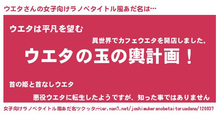 | 胡散臭い通販商品みたいなあだ名 | 『伝統あるサプリメント…その名も「ウエタ」』 |