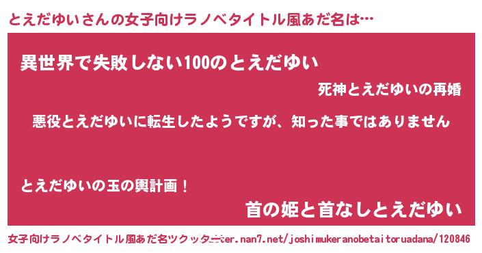 | 胡散臭い通販商品みたいなあだ名 | 『あなたにだけ特別に提供する限定10本のレアな日本酒…その名も「とえだゆい」』 |