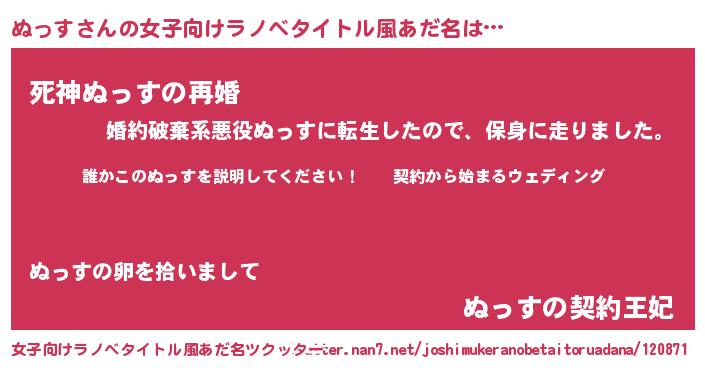 | 男性向けラノベタイトル風あだ名 | 『ヌッスアートオンライン』 |