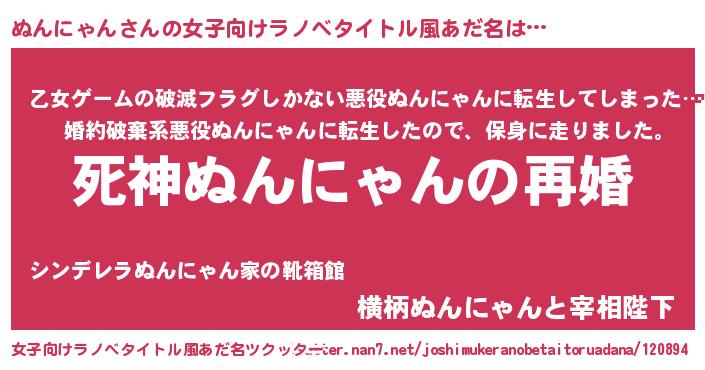 | 男性向けラノベタイトル風あだ名 | 『ノーゲーム・ノーヌンニャン』 |