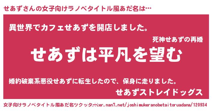 | 男性向けラノベタイトル風あだ名 | 『ダンジョンにせあずを求めるのは間違っているだろうか』 |
