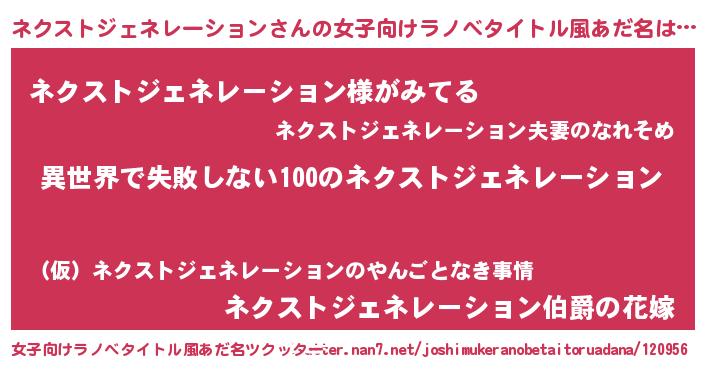 | 男性向けラノベタイトル風あだ名 | 『ネクストジェネレーションという概念が存在しない退屈な世界 』 |