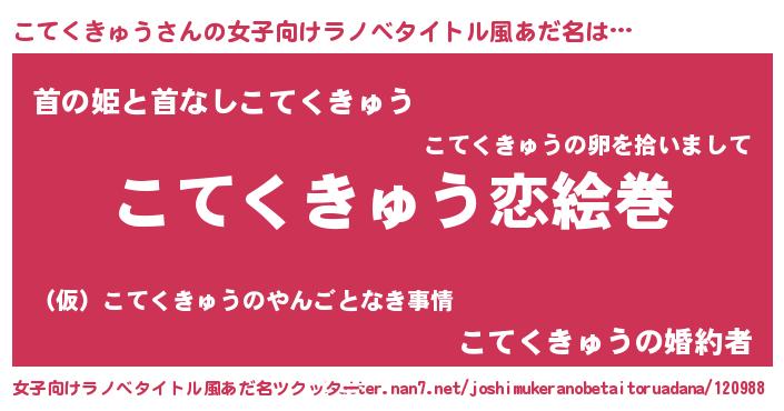 | 男性向けラノベタイトル風あだ名 | 『ノーゲーム・ノーコテクキュウ』 |