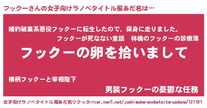 | 男性向けラノベタイトル風あだ名 | 『フックーの嫁は女の子じゃないと思った?』 |