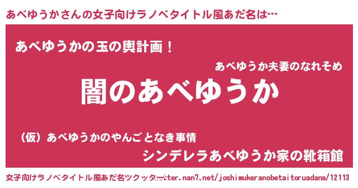 | 男性向けラノベタイトル風あだ名 | 『Re:あべゆうかから始める異世界生活』 |