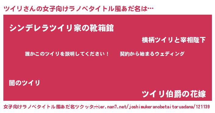 | 男性向けラノベタイトル風あだ名 | 『ツイリアートオンライン』 |