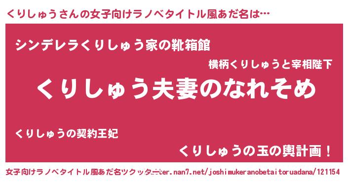 | 男性向けラノベタイトル風あだ名 | 『おまえをオタクにしてやるから、俺をくりしゅうにしてくれ! 』 |