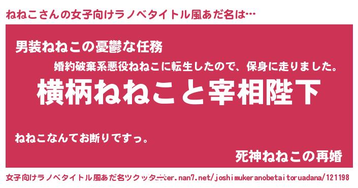 | 男性向けラノベタイトル風あだ名 | 『ねねこに滅ぼされるだけの簡単なお仕事です』 |