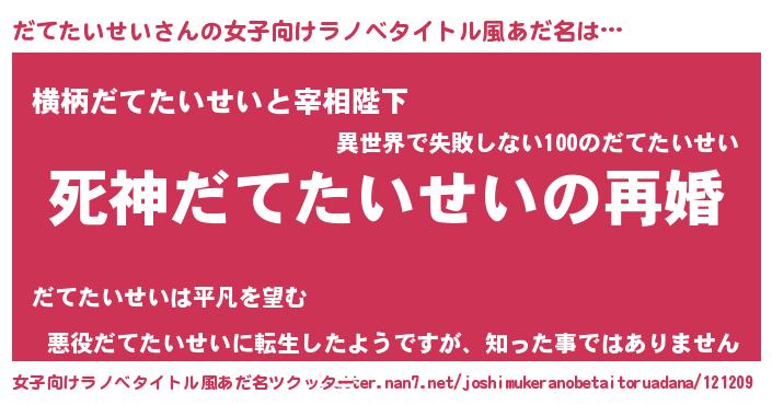 | 男性向けラノベタイトル風あだ名 | 『ノーゲーム・ノーダテタイセイ』 |