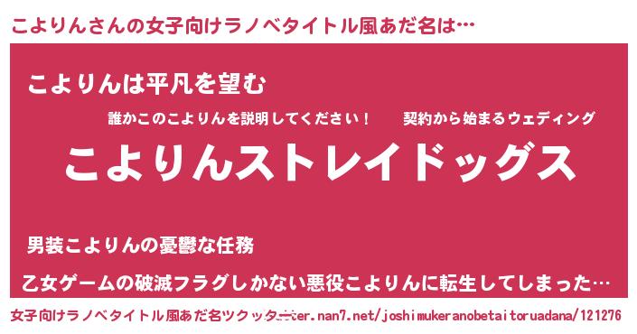 | 男性向けラノベタイトル風あだ名 | 『Re:こよりんから始める異世界生活』 |