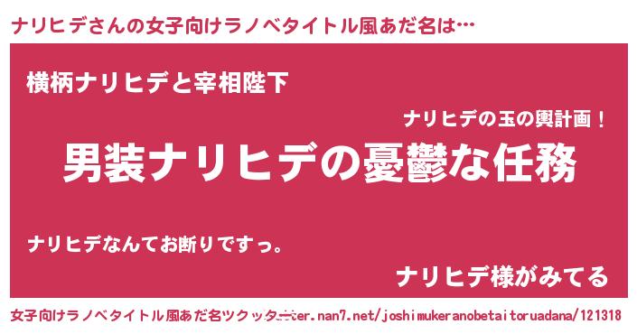 | 男性向けラノベタイトル風あだ名 | 『うちのナリヒデが世界を掌握している!』 |