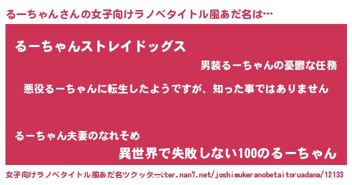 | 男性向けラノベタイトル風あだ名 | 『この素晴らしい世界にるーちゃんを!』 |
