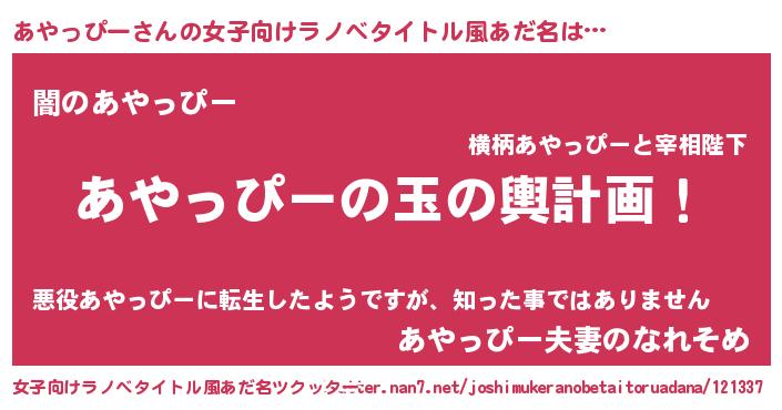 | 男性向けラノベタイトル風あだ名 | 『あやっぴー~年齢イコール彼女いない歴の魔法使い~』 |
