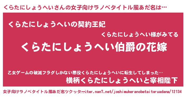 | 男性向けラノベタイトル風あだ名 | 『うちの娘の為ならば、俺はもしかしたらくらたにしょうへいも倒せるかもしれない。』 |
