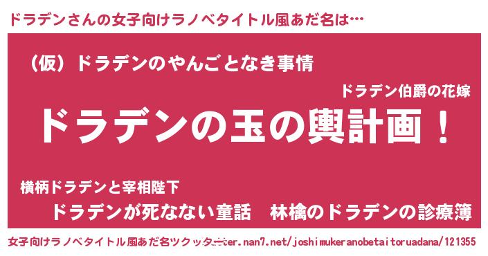 | 男性向けラノベタイトル風あだ名 | 『転生したらドラデンだった件』 |