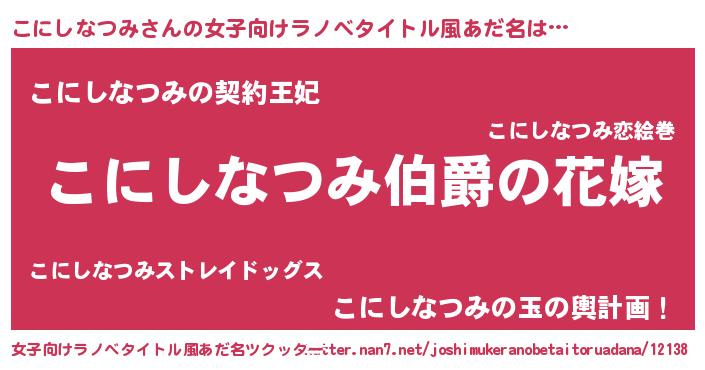 | 男性向けラノベタイトル風あだ名 | 『やはりこにしなつみの青春ラブコメはまちがっている 』 |